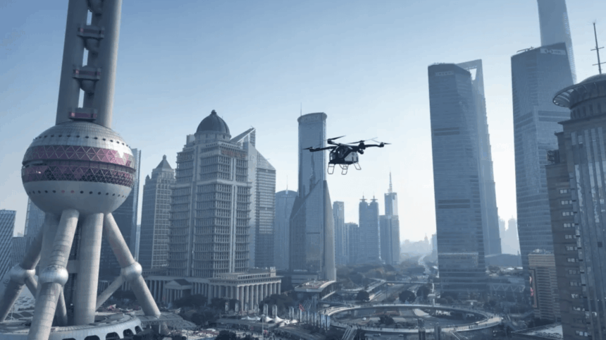 The flying car flew over iconic landmarks such as the Shanghai Tower and Jin Mao Tower.